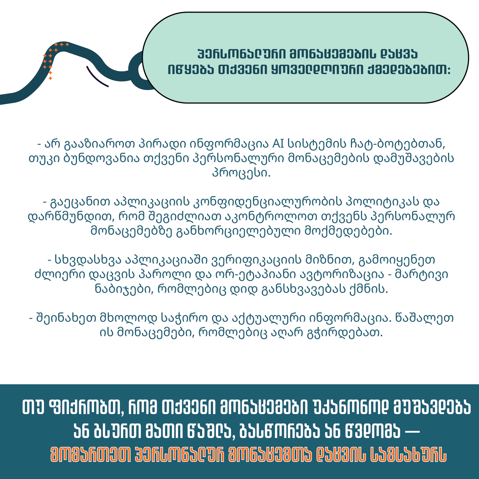 AI სისტემის ჩატ-ბოტთან მონაცემთა სუბიექტის ან სხვა პირების მაიდენტიფიცირებელი ან განსაკუთრებული კატეგორიის პერსონალური მონაცემების გაზიარებამდე საჭიროა განსაკუთრებული სიფრთხილის გამოჩენა.